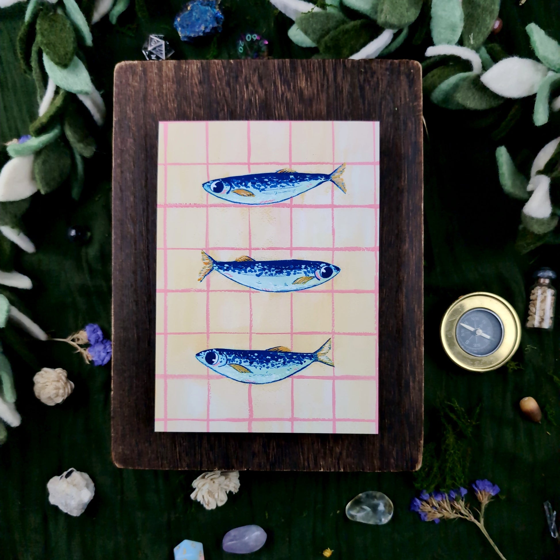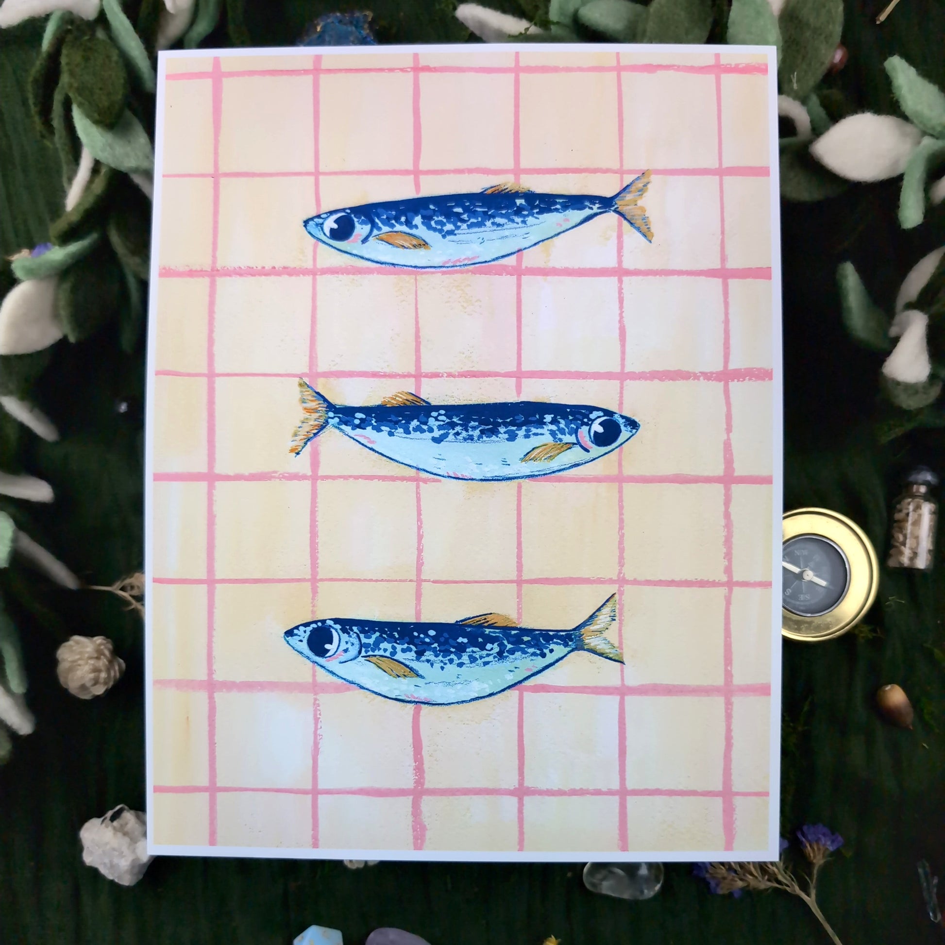 Summer Troupe - A trio of blue sardines on a pink and yellow grid background.